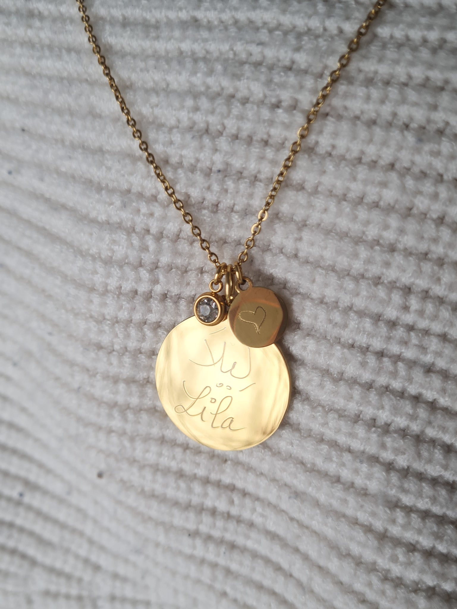 Un collier avec deux médailles à personnaliser en Arabe et une pierre de naissance, fin et délicat, sera le cadeau parfait en toute occasion.